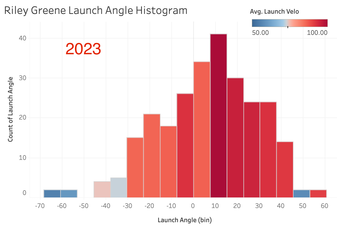 What you have here is the total number of balls in play hit in each angle range. You can see that in 2023, his highest bars were between 0 and 15 degrees. That put his average launch angle in 2023 at 6.6 degrees and his median at 8.0.