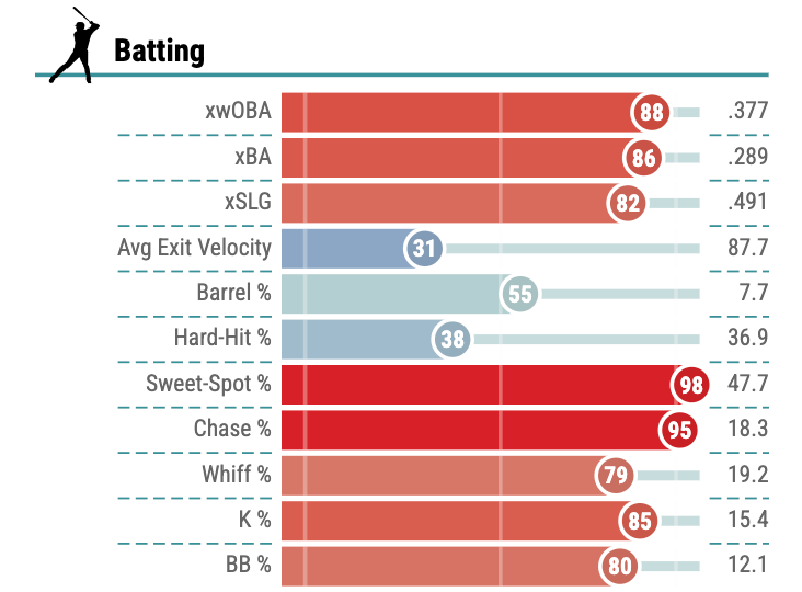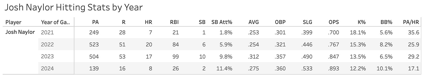 I’ve long highlighted Naylor’s unique ability to barrel the ball while managing a really low K%. This year he’s at a good but short of elite 10.5% Brl%, but that is boosted by the fact that he so rarely strikes out at just 12%. So he’s putting a ball in play in nearly 80% of his plate appearances, which turns into a lot of fantasy goodness even on a more middle-of-the-road Cleveland offense.