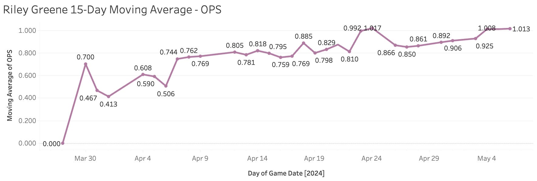 Greene has arrived this year. Only four players have more than his nine homers, and he’s been absolutely crushing ever since the first 10 or so days of the season after a slow start: