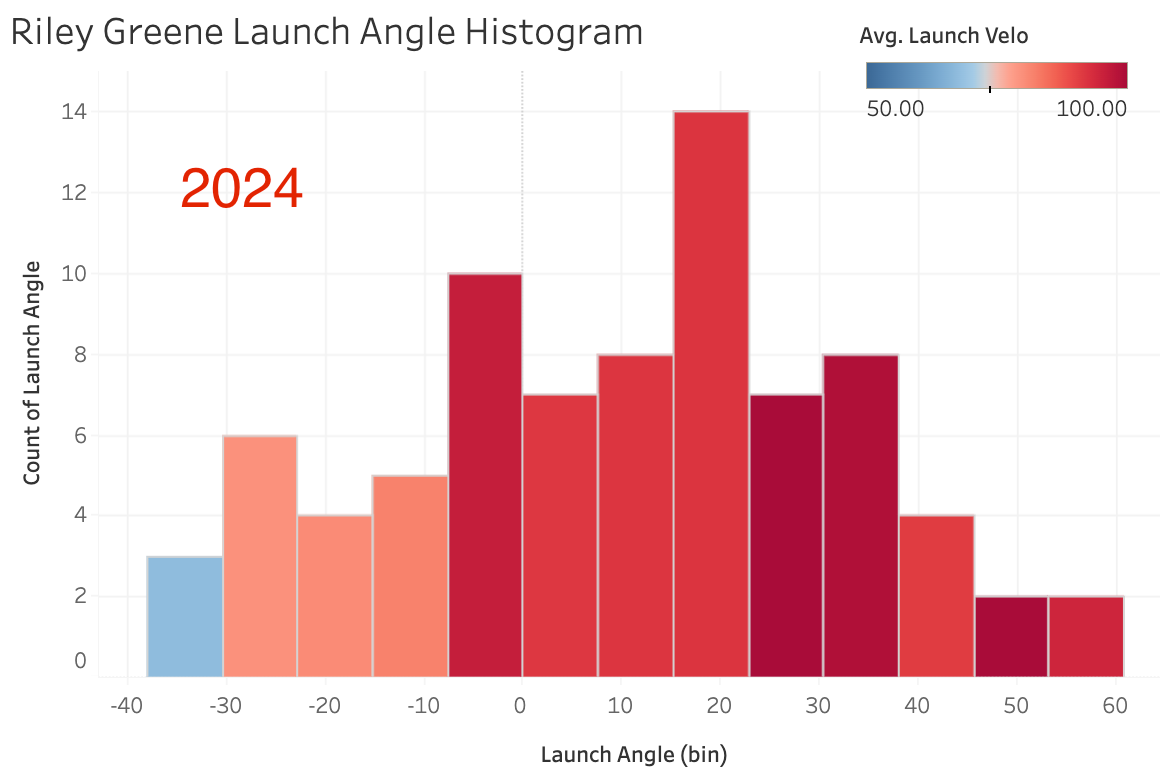 Looking at 2024, you can see the bar towering above the rest is centered right on 20 degrees - right where you want it. This year Green’s average launch angle is 9.5 degrees and the median is up to 13.5. Big improvements on that regard, and this was something he himself said he wanted to change coming into this season.