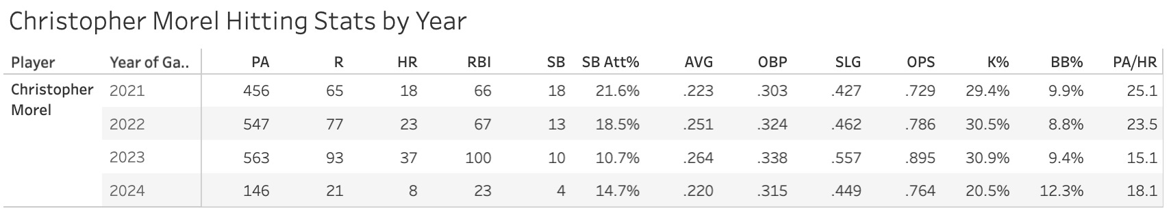 Ever since arriving in the Majors in 2020 (he’s been up-and-down since then), he’s limited the strikeout while hitting a bunch of balls hard. That has gotten us excited before only for him to manage a career-best nine homers (2023) and .704 OPS (2022).