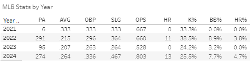 274 PA, .264/.336/.467, 13 HR, 25.5% K%, 7.7% BB%