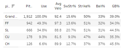 There is no way to criticize the man. He posted a 14.3% SwStr%, a 51.7% Strike%, a .193 xBA, and a .249 xwOBA. The four-seamers plus sinker/splitter combination is deadly, and he had three pitches earn a Strike% above 50%.
