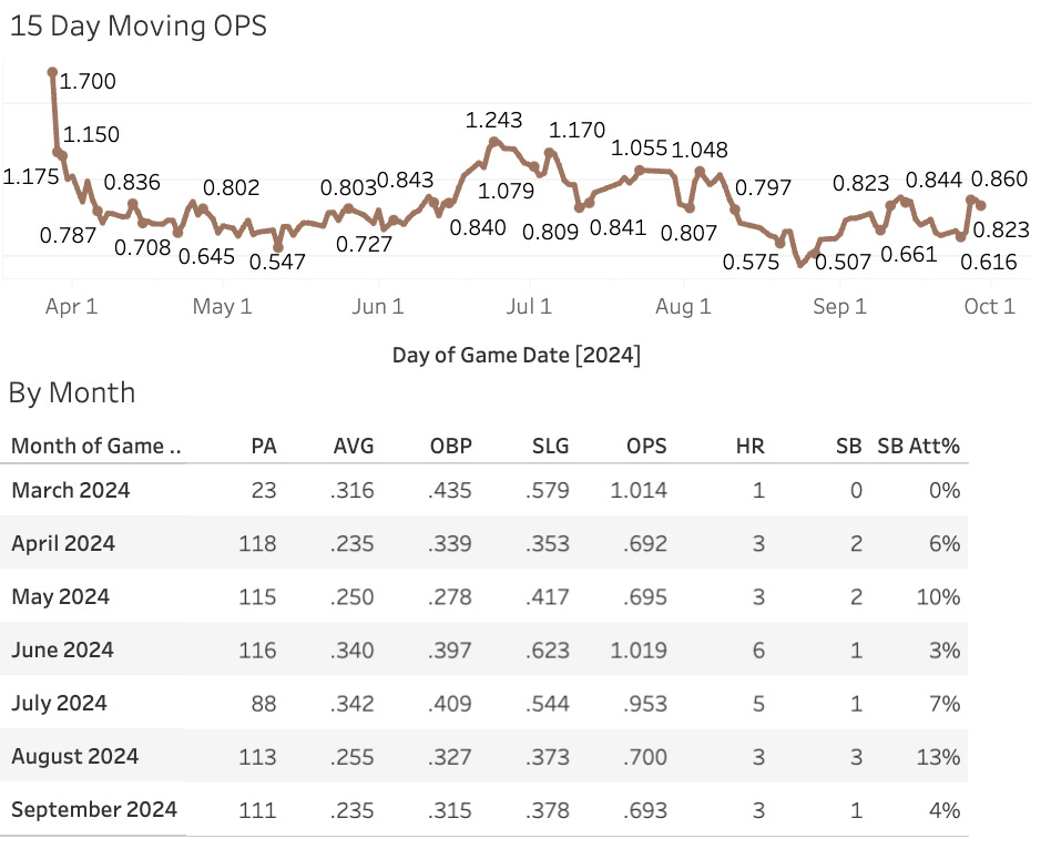 There was clearly some bad variance in there. BDLC has been in the league for a while now and has proven himself to be a league-average bat. Since 2021, he’s a .252/.296/.407 hitter. That’s a .703 OPS with about a 21-homer pace. He’ll be 28 next season, so I think the fair expectation is for him to be a league-average hitter once again next year, and that will be nice for Pittsburgh after seeing him weigh down their lineup for two months in 2024. He’s not a standard fantasy league bat, but he is a decent buy-low option in deep five-outfielder leagues.