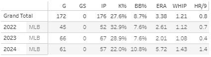 2024: 31 GS, 178 IP, 4.25 ERA, 1.30 WHIP, 21.5% K%, 6.5% BB%