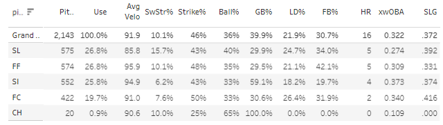 The slider is good, but it’s not so good that he can get by using that as his main pitch in a starter role. The four-seamer has enough velo, but it just doesn’t fool hitters very often with that 10.1% SwStr% and 48% Strike%. After that, he has a pretty crappy trio of the sinker, cutter, and rarely-thrown changeup.
