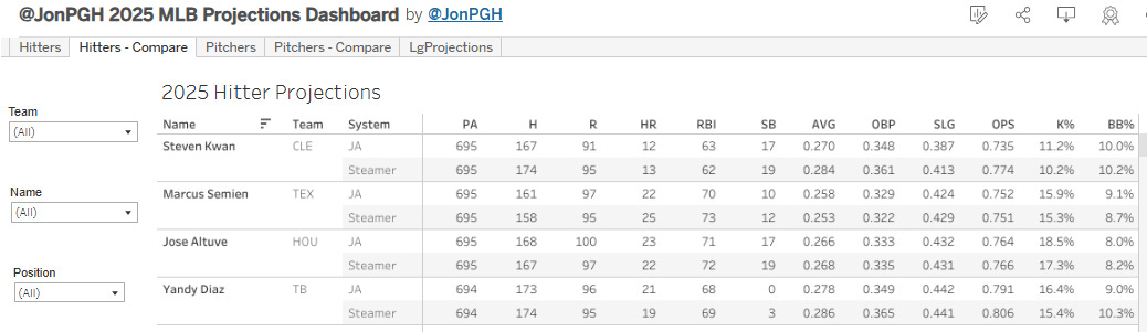 The second method is a Tableau dashboard. This thing smacks. I include the other free systems in there as well so you can compare my model with the other big boys. Right now, it’s just Steamer and me, but the other systems will get in there when they release (in January, I believe).
