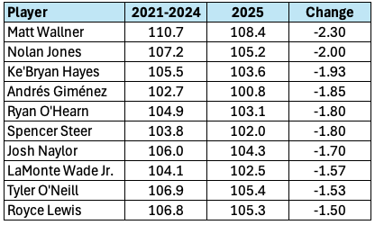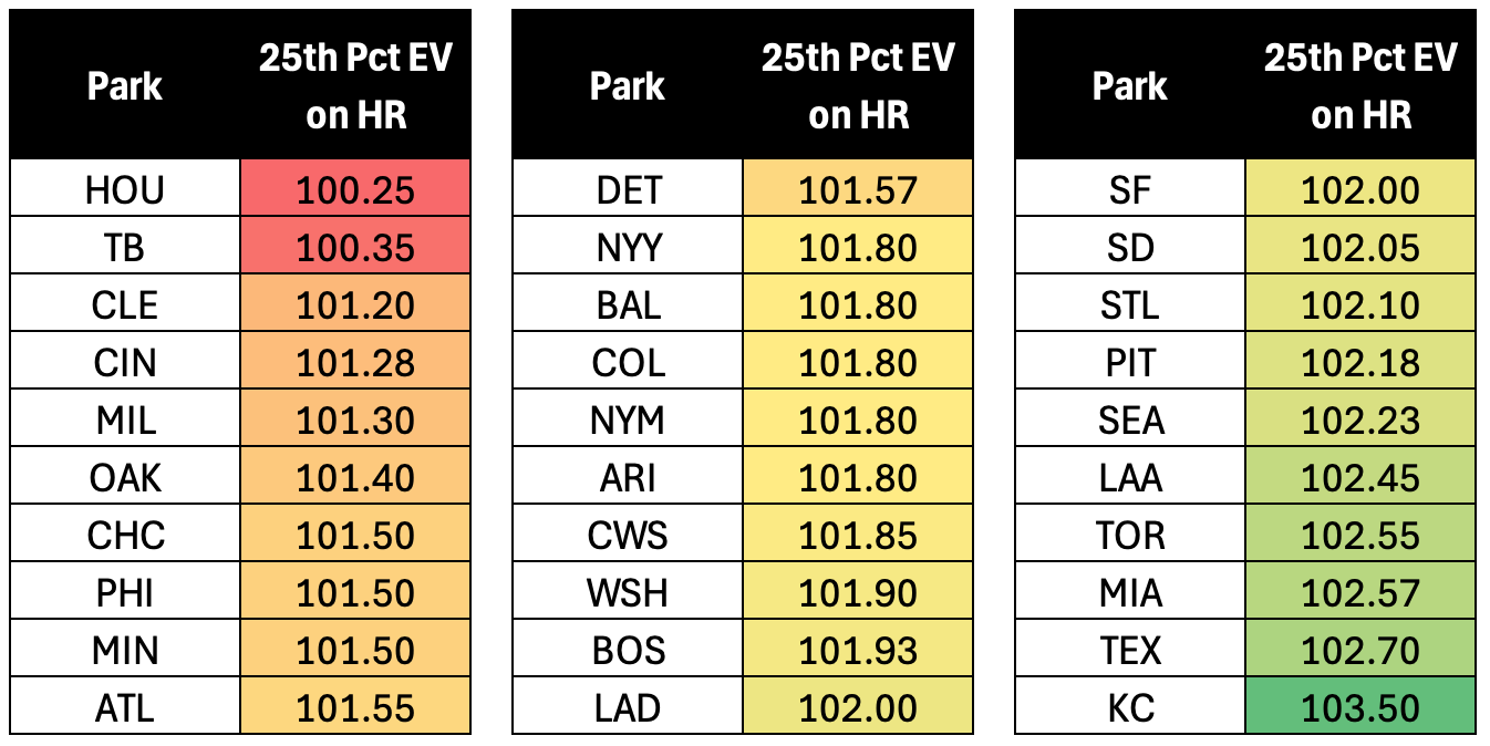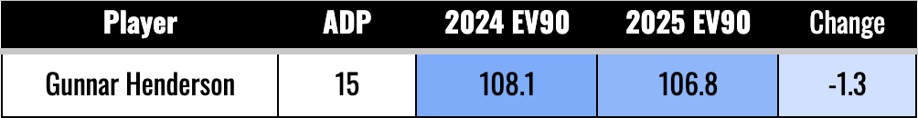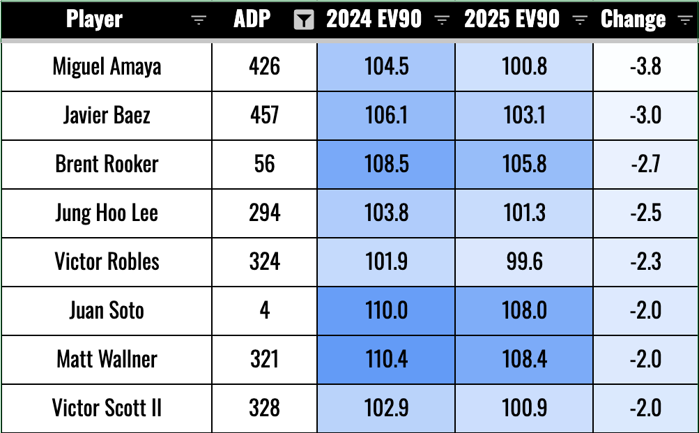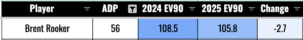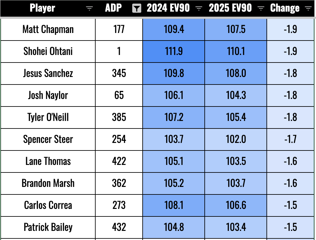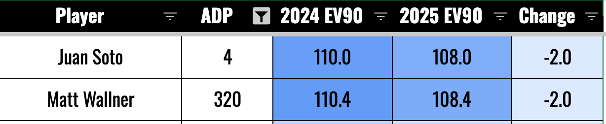 As we talked about with Soto and Wallner, going from 109 to 107 isn’t a big deal. If you’re well above 105, we’re not worried much about it. I mean, more is always better, but we’re more concerned about the guys who went from 105 to 103. That seems to be the range where you’d start seeing some dingers go for flyouts.