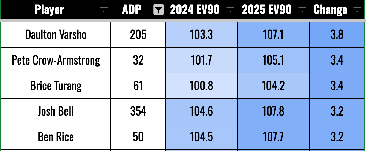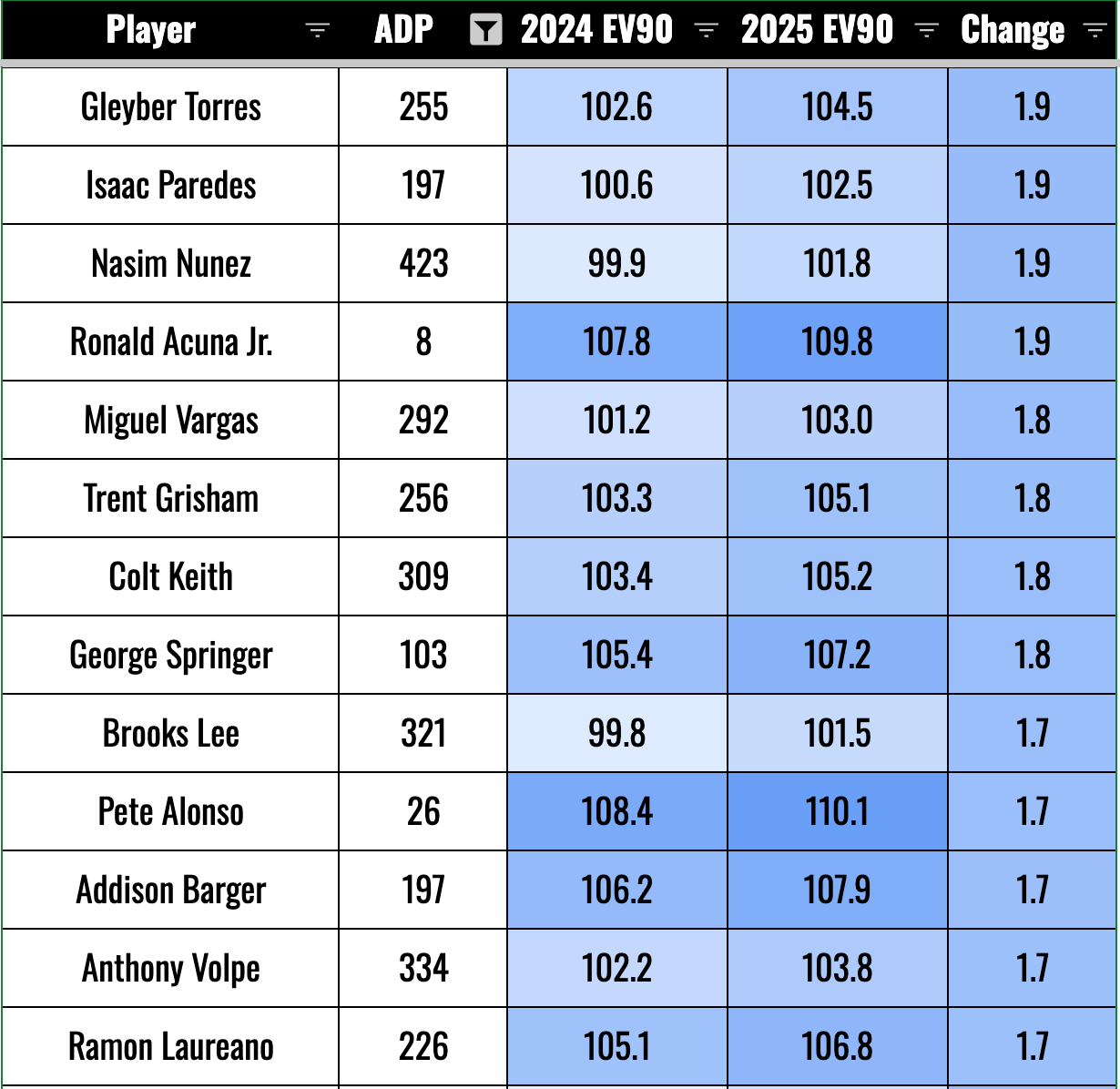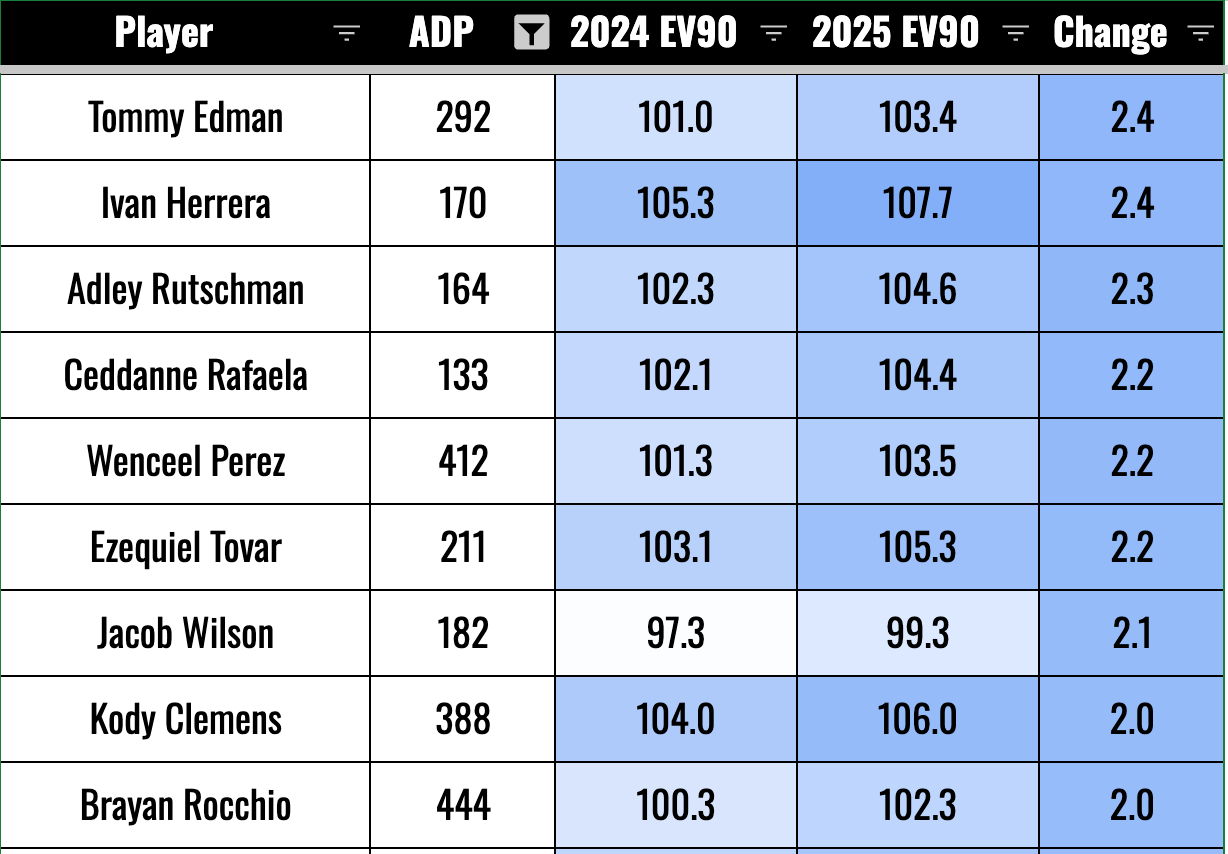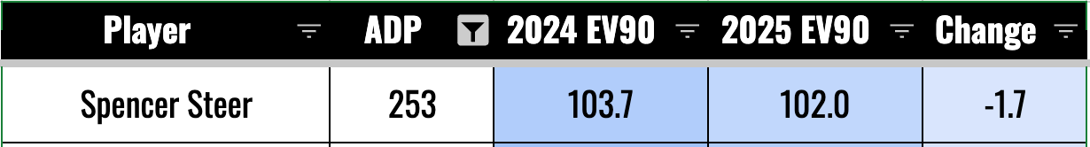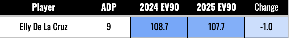 This is mostly bad news, but we’ll also want to look for the guys who might have been playing hurt. We should be trying to buy in on players who are likely to bounce back after down years that came from playing hurt. Elly De La Cruz is a good example of this. He lost one mile per hour on the EV90, and we know for sure he was playing for a good chunk of the year with a bad quad.