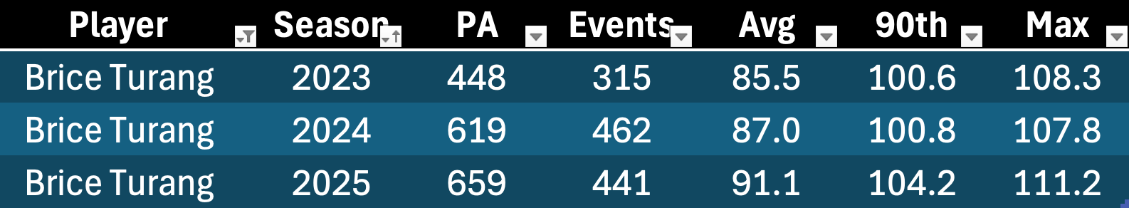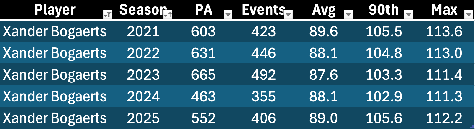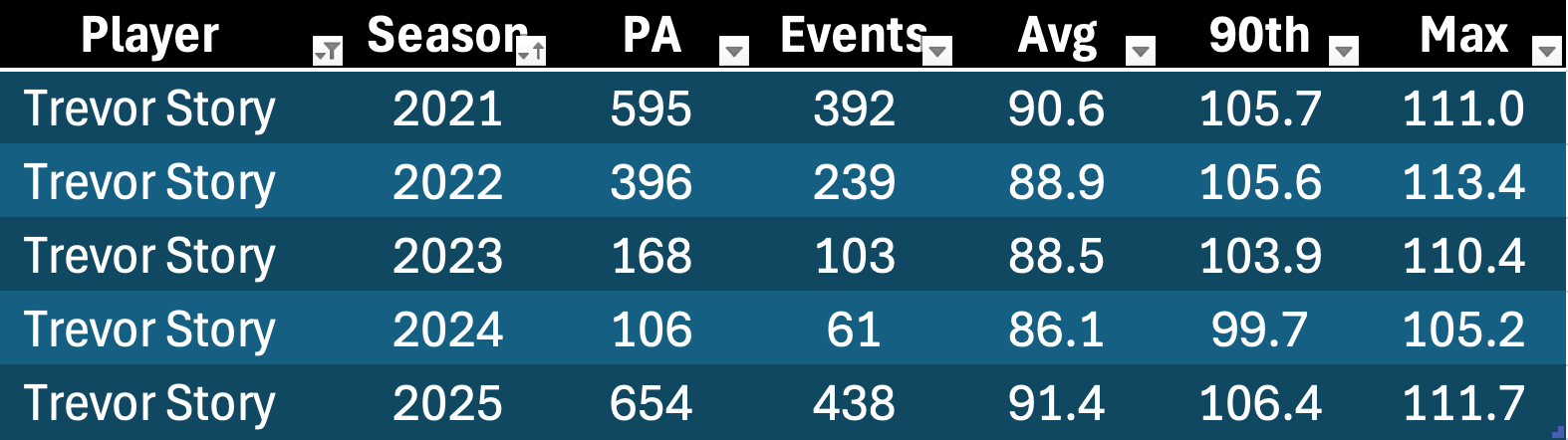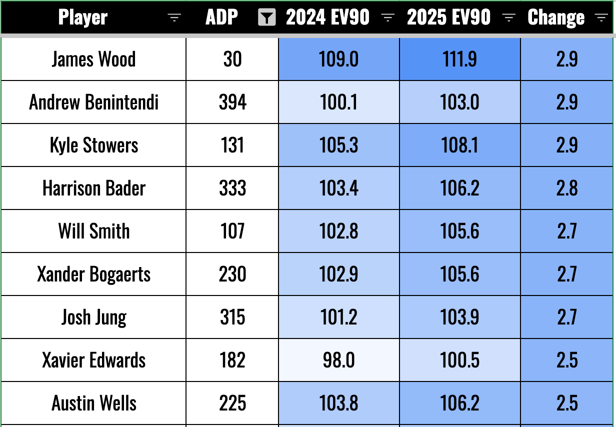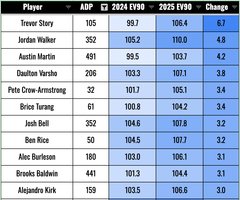 It’s interesting to see Soto here. His EV90 went down, but he hit two more homers in the same playing time. But a 108.0 EV90 is still elite, and he hit a few more fly balls last year. Nobody is worried about Soto’s power production at the age of 27. He seems to be in his prime power years right now with plenty more to go.