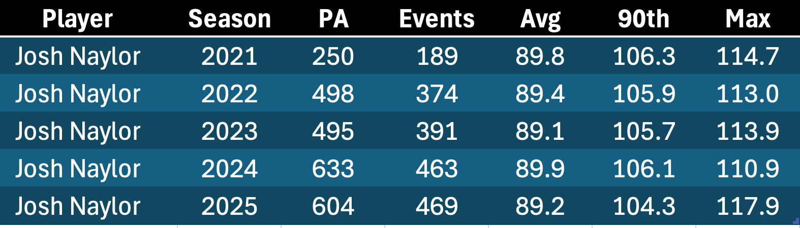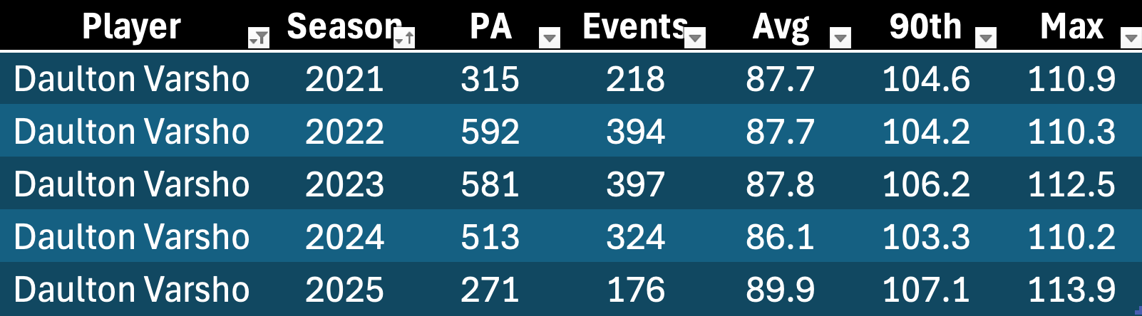 I’m just putting these guys all together. Looking back, we probably should’ve been in on the Daulton Varsho potential. He went 104.6, 104.2, and 106.2 before a dip down to 103.3 in 2024.
