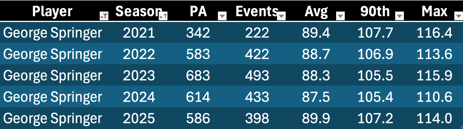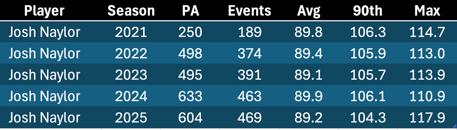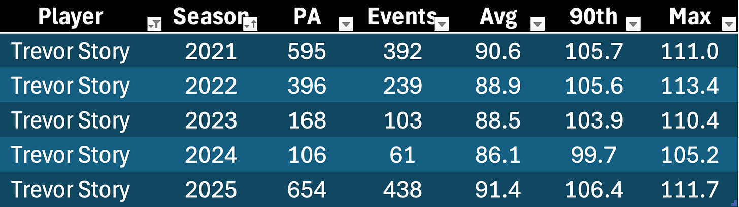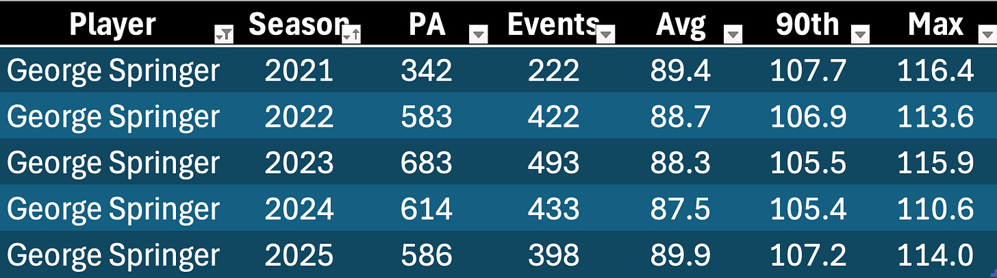 I will eventually do a bit of a study on Springer from last year to see if we can make some predictions about veterans who could follow in his footsteps. You can see here that his EV90 never dropped below 105: