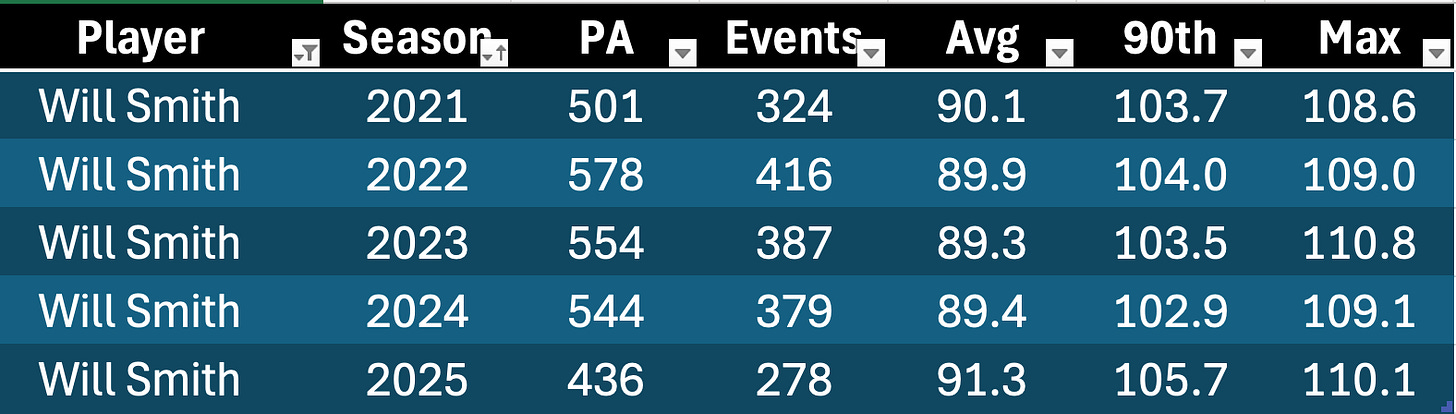 Will Smith played just 110 games, but he reached a career-high .901 OPS. He did the best work of his career by a good margin with the bat. And it was powered by a +2.8 in EV90 with a +1.7 in average.