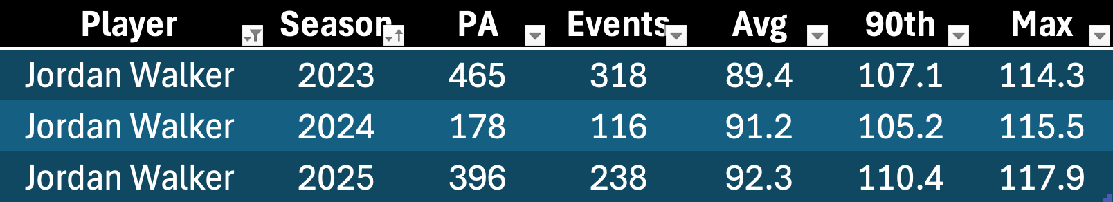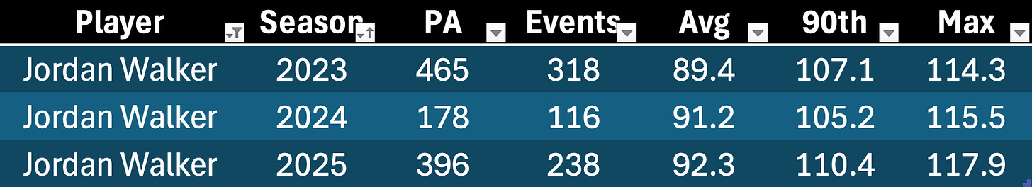 We’ve never questioned Walker’s raw power. It’s not a surprise to see him put up a big EV90 number, but 110.4 was striking. He was really hitting it hard last year. The issue was and is the launch angles