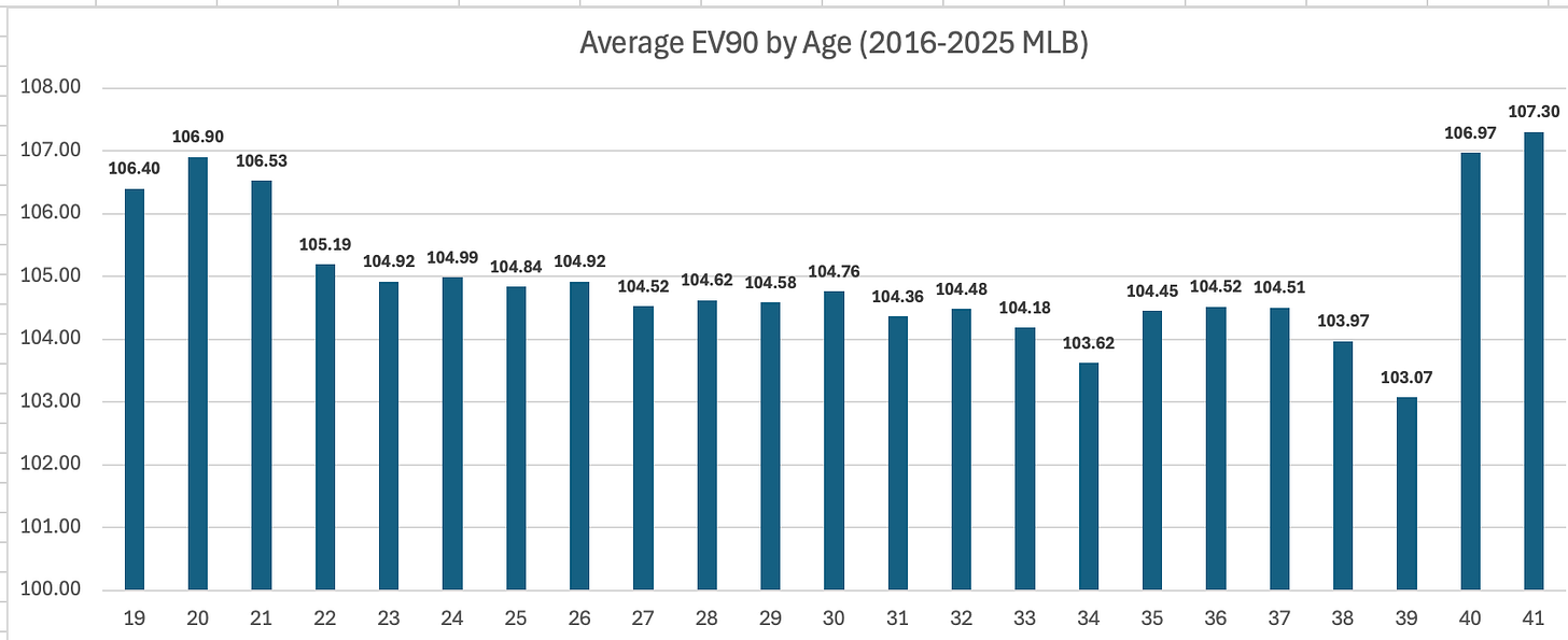 The lesson we learn there is that EV really doesn’t start clearly descending in the same way that bat speed does. And that’s probably because exit velo is about more than just how hard you’re swinging the bat. You can get into your mid-30s and still put up high EVs if you’re constantly squaring the ball up. And that’s what we typically see with guys who are staying in the lineup at 33-36 year olds.