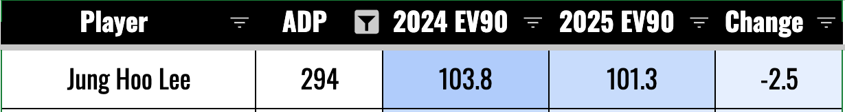 I fell for the Jung Hoo Lee thing last year. I saw the strong contact marks, the foot speed, and the decent EVs and thought he could break out. And that wouldn’t have happened even if he did keep up the EVs. The guy just doesn’t hit fly balls, and he doesn’t have the will to steal bases. So it was a dumb take by me. Honestly, I was pretty trash with my draft advice last year. But I think I’ve learned some lessons and can do a better job this year.