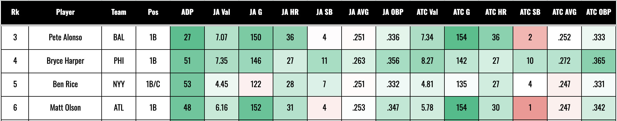So I think they’re all about the same, and I’d be happy to take any of the four that fall. There are a lot of dudes I like later than this, as we’ll see, but I can’t make a great case against anybody. And if Bryce Harper is going to fall to the sixth round, he’s not getting past me. That’s how I approach it. I’m fine with missing out on the first six first baseman, but if any of them fall, I’ll jump in.