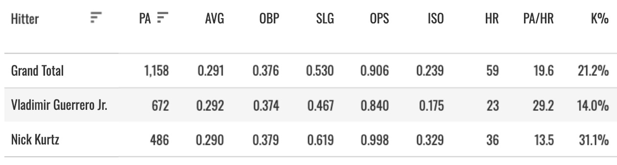 They both hit around .290, they both had OBPs around .375, but Kurtz outslugged Vlad like crazy. His 13.5 PA/HR was elite. By those numbers, it’s not close.