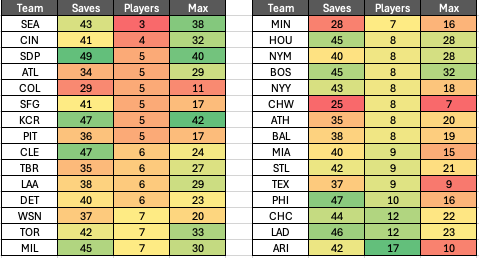 First, let’s look at some teams to generally avoid this year. Here’s the breakdown of how many players got saves for each team last year: