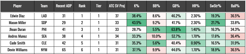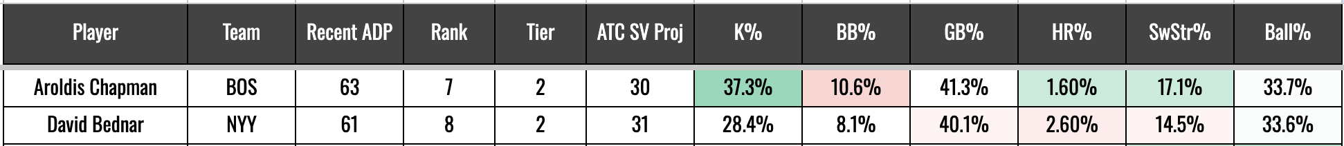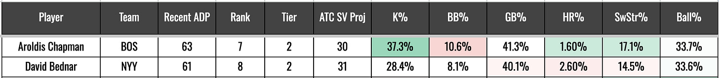 The Red Sox and Yankees closers are near the top of the board this year, but I’m pushing them down into their own tier below the big boys. David Bednar has been inconsistent in his recent career (although not last year while he was on the Yankees, and he’s clearly the closer for them), and Aroldis Chapman wasn’t anywhere near here in previous years. His crazy breakout with the Sox last year push him up here. And that’s fine, but how can you draft him as confidently as you can Edwin Diaz, Mason Miller, etc.? You can’t, don’t be silly. But if he’s even 75% as good as he was last year, he’ll get a bunch of saves.