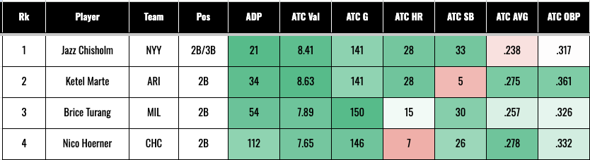 Jazz Chisholm Jr. has the super coveted 2B/3B eligibility. That’s very, very nice to have, as it lets you plug him in at a corner or middle infield slot as well. That’s a boost. Chisholm is one of the few 30-30 threats in the league. His flaw is the batting average. You’re potentially taking on a .230 batting average in 600+ PAs with him. So you have to build around that. But overall, he’s my #1 and I didn’t have much trouble with that ranking.