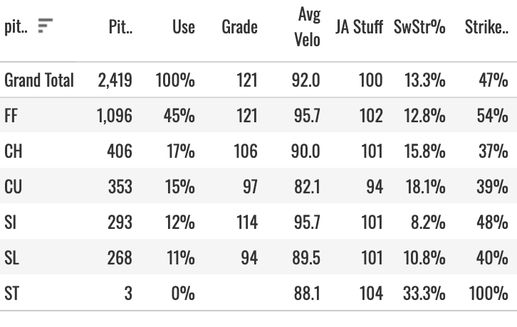 You don’t find too many guys with a 13% SwStr% on a fastball with two pitches behind it, also getting a bunch of whiffs. Smith’s issue is the command. His 37% Ball% wasn’t great, and it turned into a walk rate above 9%.