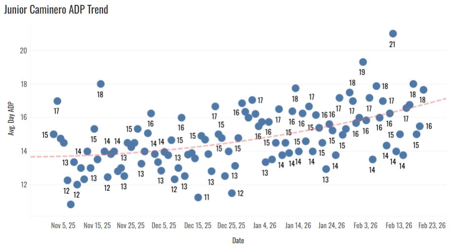 The ADP movement on Caminero has been interesting. He started early draft season as late-first/early-second round pick. Now he’s sliding back to the middle of the second round, and he’s even gone at #21 recently.