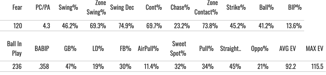The other thing that stood out was the super high walk rate, especially with the 46% Swing%. It was the highest walk rate in the league, and nobody over a 43% Swing% was anywhere close. That makes some sense when you think about it. Pitchers were afraid of his power, while not being nearly as afraid of his base running. A few of those key Braves bats (Riley, Ozuna, Albies, Harris) were either absent or struggling for most of the year, so it made sense to be careful with Acuna. He saw a very high 41% Ball% against, and a 120 FEAR SCORE (which is a mixture of strikes seen, fastballs seen, intentional walks, and other stuff like that, all graded on a scale where 100 is the league average).