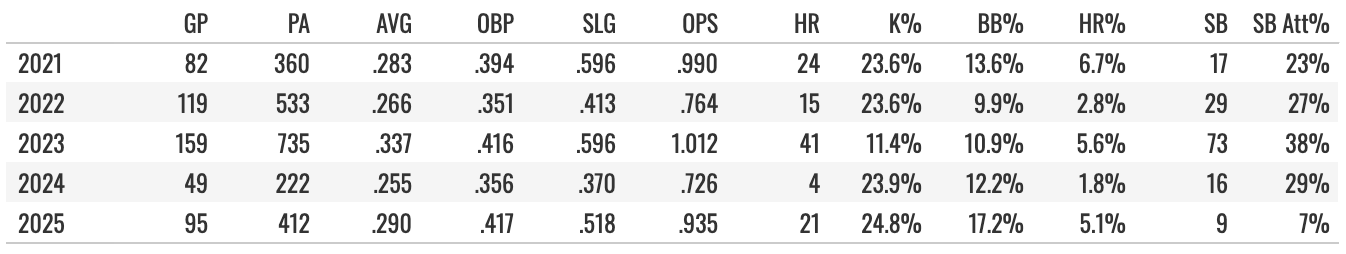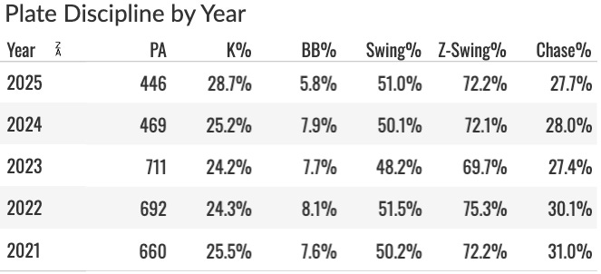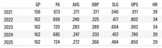 The main issue is the health. He hasn’t played a full season since that 2023 season. But he also hasn’t swung the bat like he did from 2021-2023 lately, slugging .461 in 2024 and then .428 last year. His K% also ballooned to almost 29% last year.