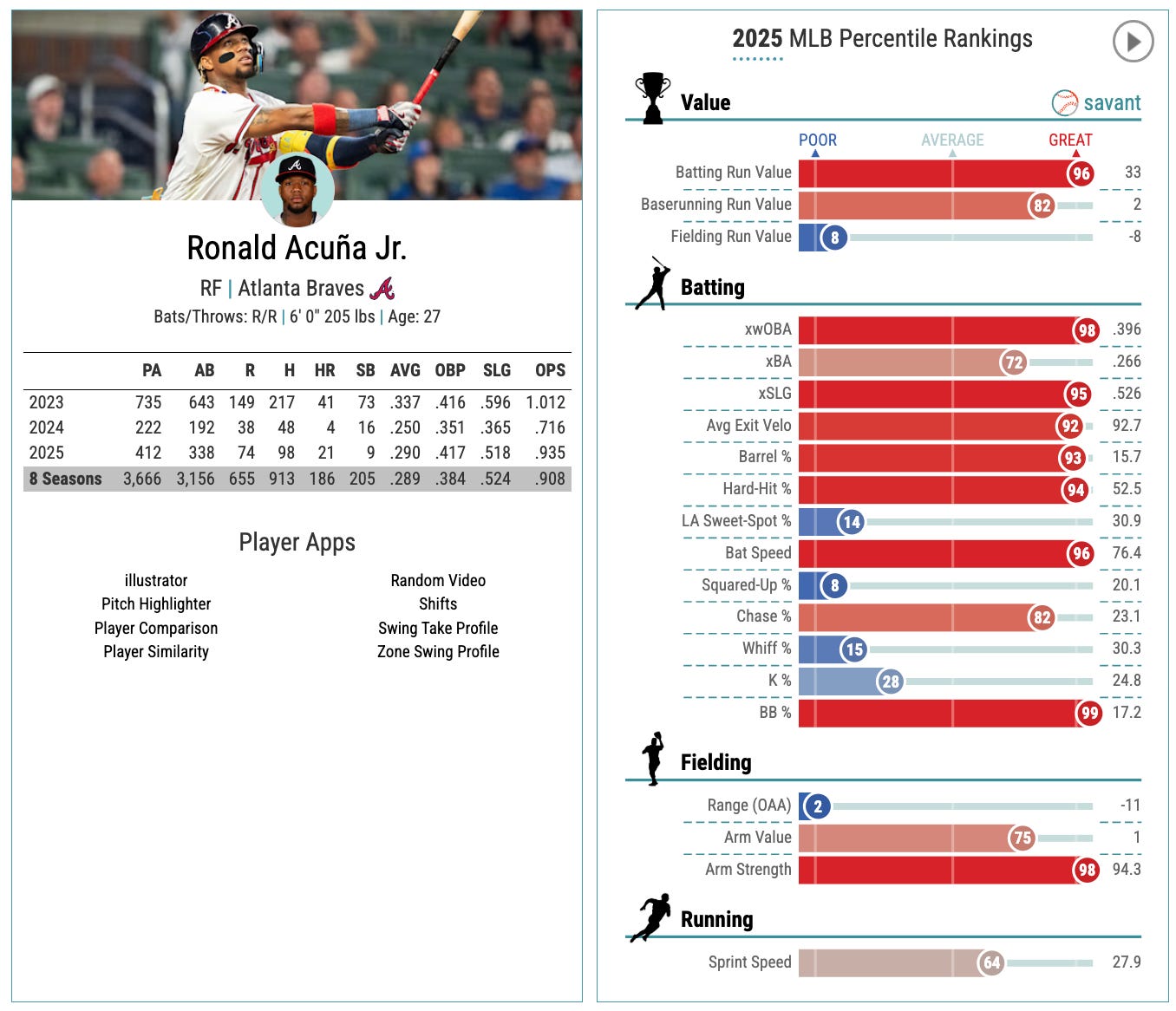 It’s been since 2023 that Acuna has played a full season. He’ll have a good shot to do it again this year. That fact alone means he’s a first-round pick again. He returned to the Braves lineup in late May. There were some highs, and there were some lows. But the end-of-season line was just fine: