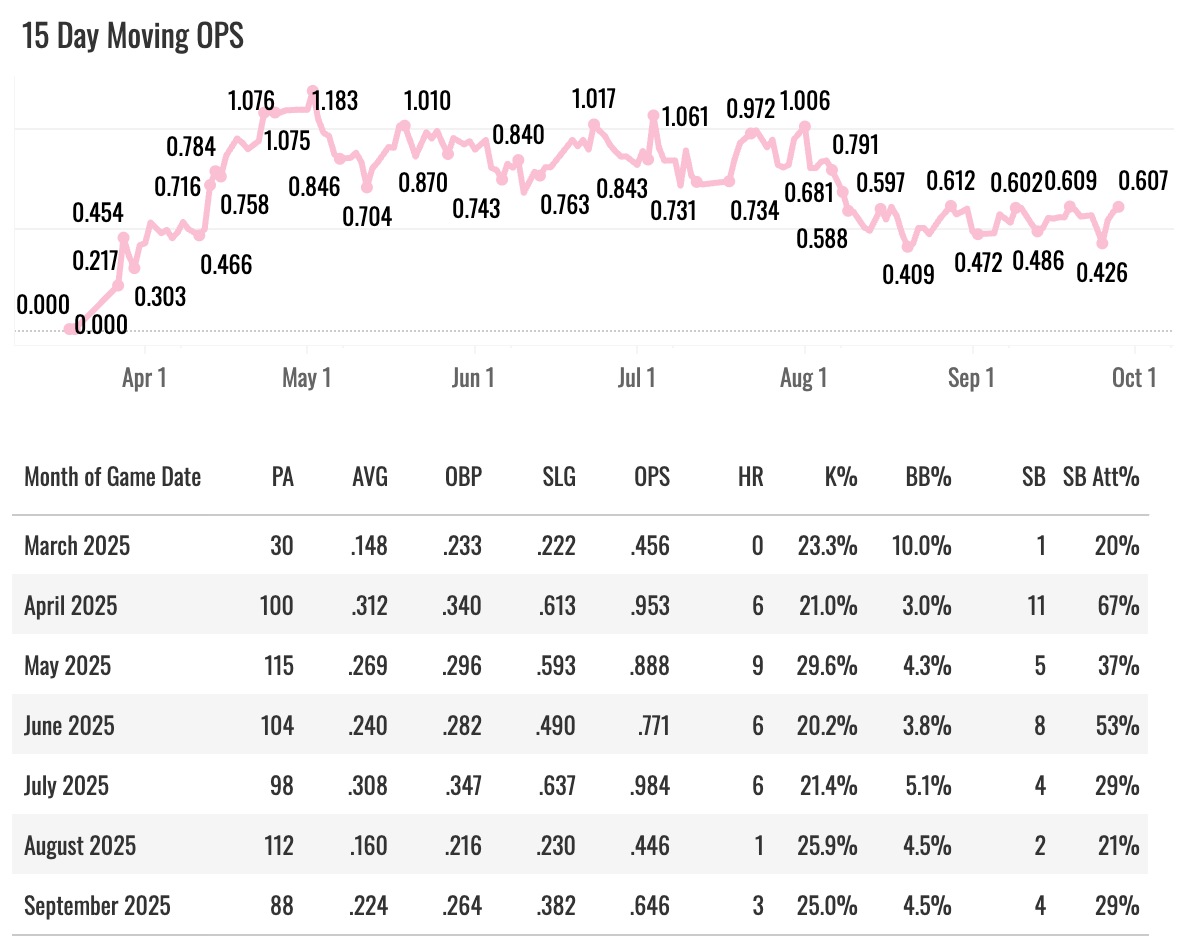 The steals popped down in 2025. A 14% attempt rate dropped to 5%, so that hurt the fantasy value quite a bit. Like PCA, he had a couple big streaks:
