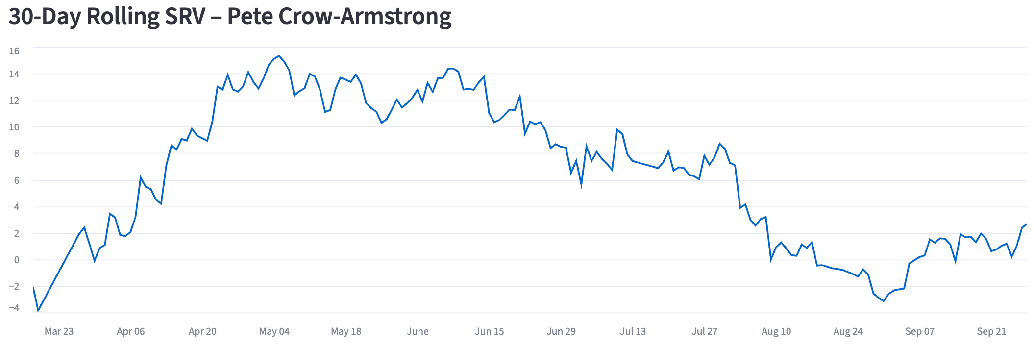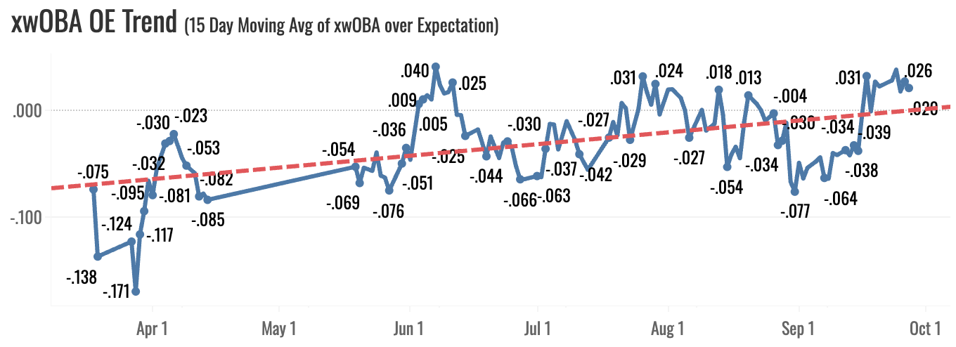 He lifted the ball a ton with a 33% GB%, and that turned into a 13% Brl% and a .333 xwOBA, +0.005 above expectation. You see the elite air pull up there, and that’s how he got to the 30-homer season, primarily.