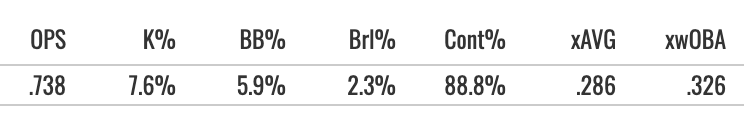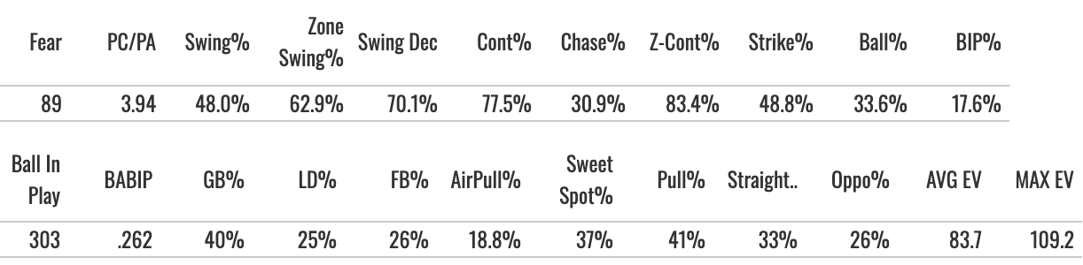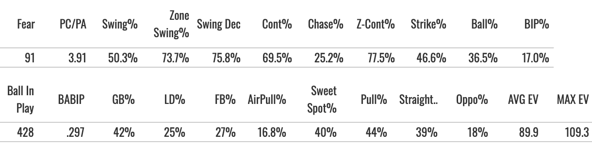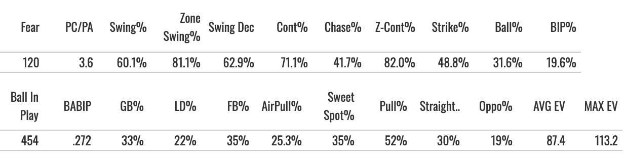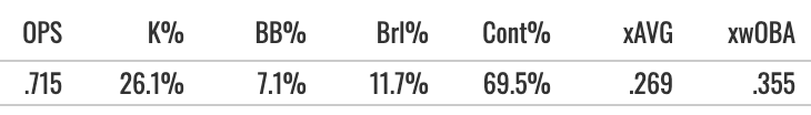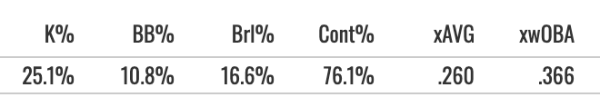 The best thing about him is the power. And we saw new heights for him in that regard. His 16.6% Brl% was elite, his EV90 reached 106.9, he got the air pull above 20%, and the batted ball profile was awesome.