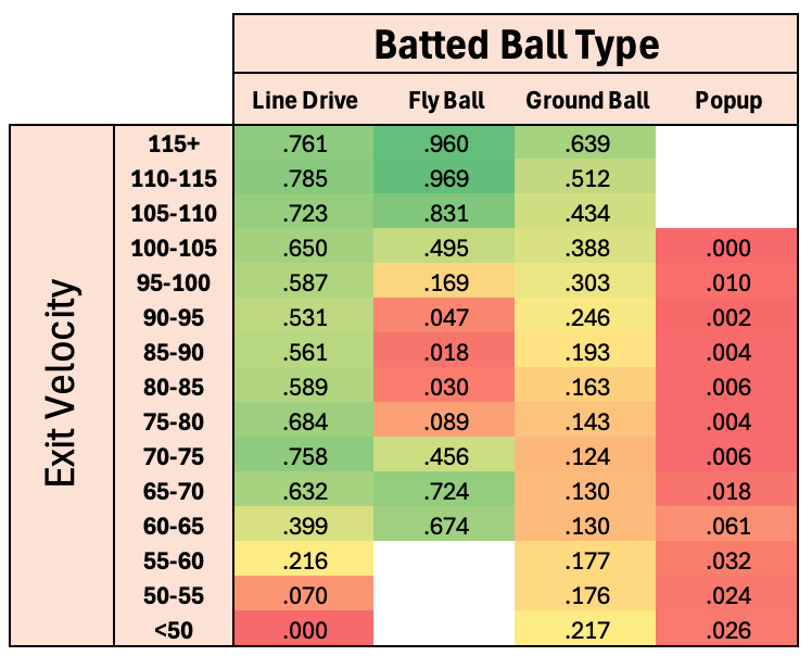 Hitting 80-100mph fly balls is not a good thing if you’re looking for base hits. You’ll get some homers and doubles above 95, so the slugging might be fine, but those balls are caught 80%+ of the time.
