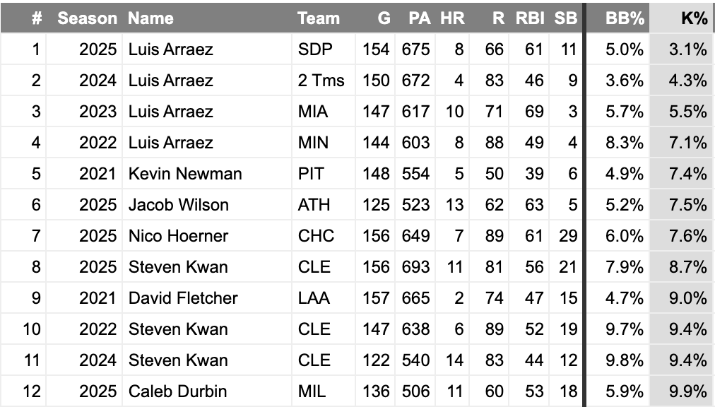 That’s a good fantasy player! The 7.6% K% was the 7th-best of the last five years. Not many guys get that many balls in play.