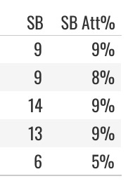 His SB attempt rate isn’t elite at 19%, but he ends up first base so much with all of the singles he hits that it’s turned into 42, 31, and 29 steals the last three years. He’s in the top 15 in steals projection across the different systems.