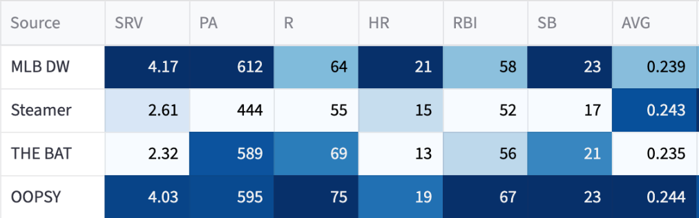 My model gives him the best season of the bunch, giving him 24-11-.254. That’s a standard league player, so he’s someone to know. But it’s just another yellow situation where I don’t really want the guy, but I’ll take him if it fits.