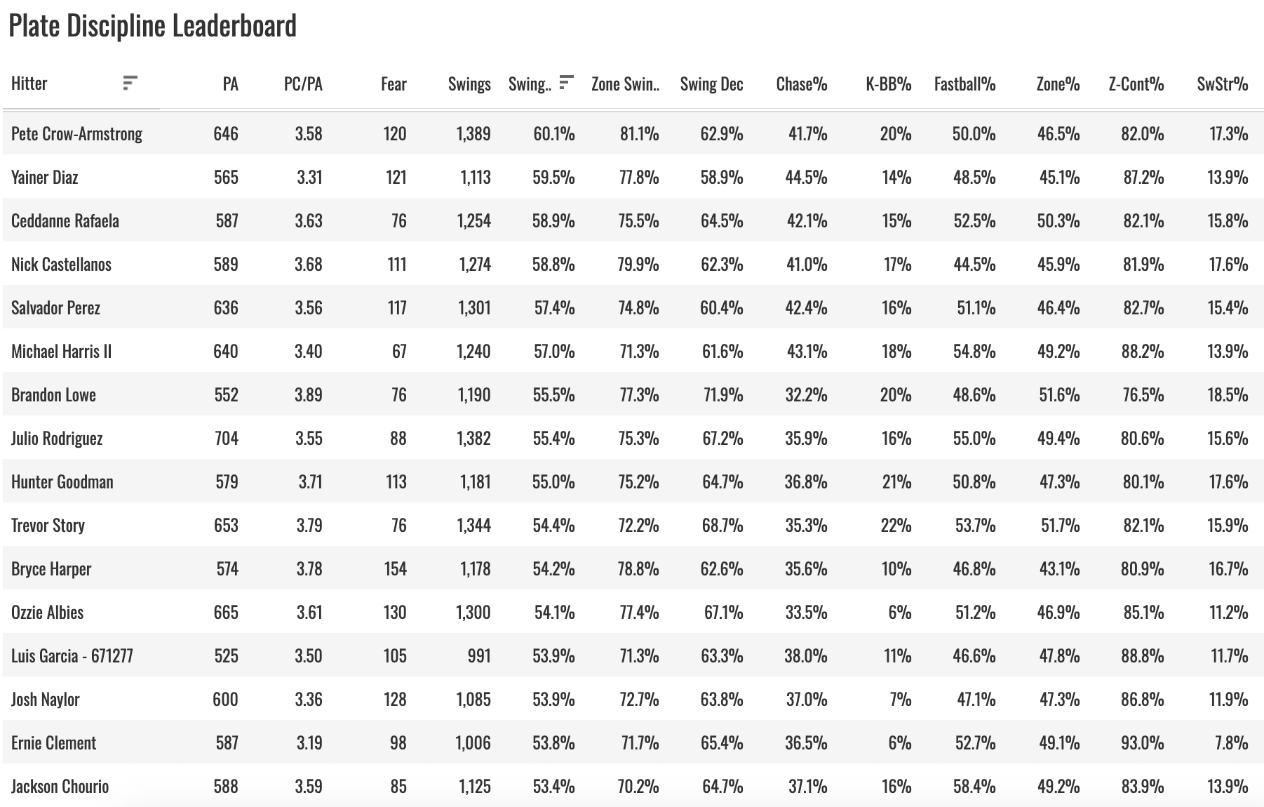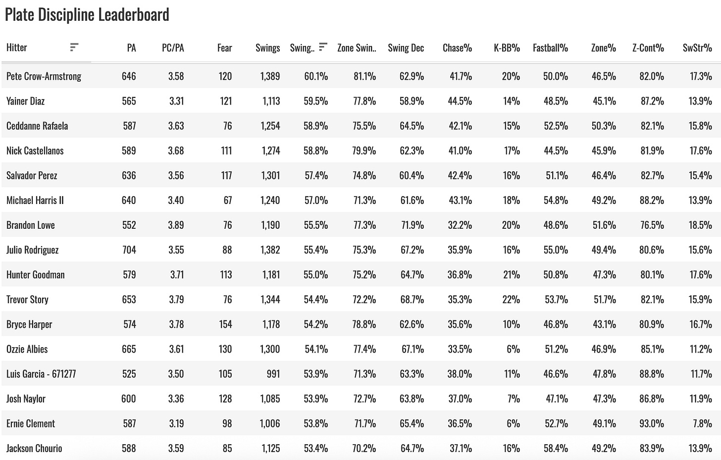 Crow-Armstrong’s overly aggressive approach at the plate makes him susceptible. He swung 60% of the time last year. It did slow down a little bit (57%) in those final two months while he was struggling, but he’s a hacker, man!