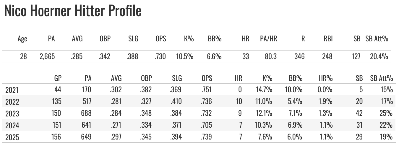 Hoerner did what Hoerner does in 2025. He started the year with an injury that I thought could be a problem, but it wasn’t. He played 156 games with a .297 batting average and 29 steals.