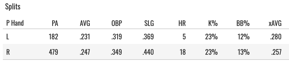 Better xBA as a righty, but more power from the left side. He led off some in both situations, so that doesn’t seem to matter all that much.