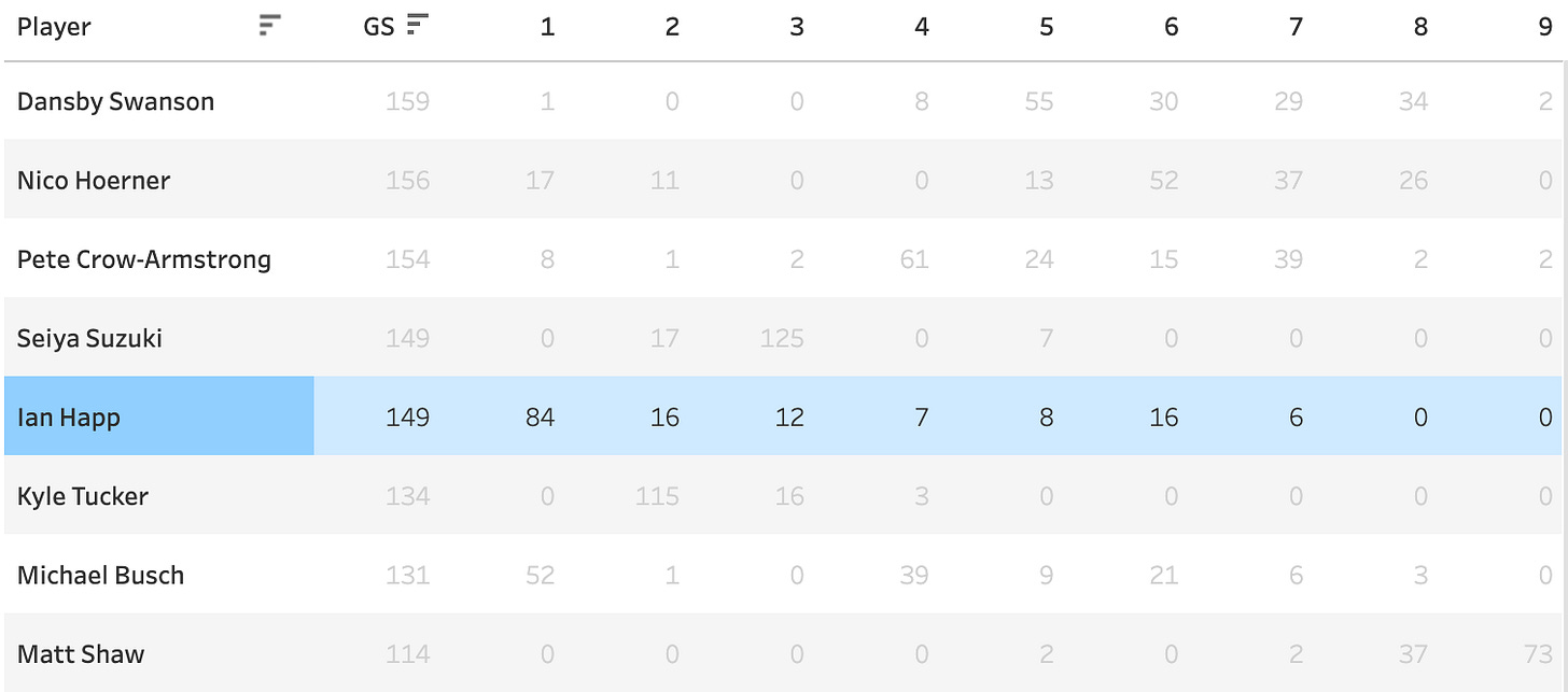 The Cubs probably prefer to have him DH. He’s older, and hasn’t been much of an outfielder. That could cost him a few starts here and there. They probably need to get Moises Ballesteros some DH reps. But with Tucker out of town, they’ll probably just have to use him in the outfield. His starts by spot last year: