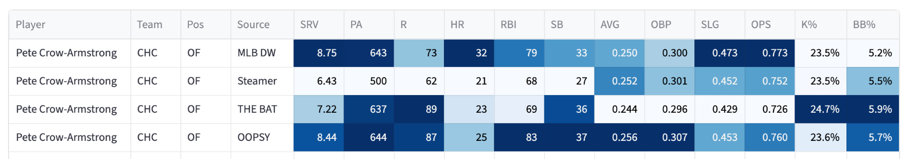Steamer is so jacked up with the playing time projections. I’m the high man, with another 32-homer projection for the kid. I’m building in some power growth with his age, but yeah, that’s a rosy projection from your boy.