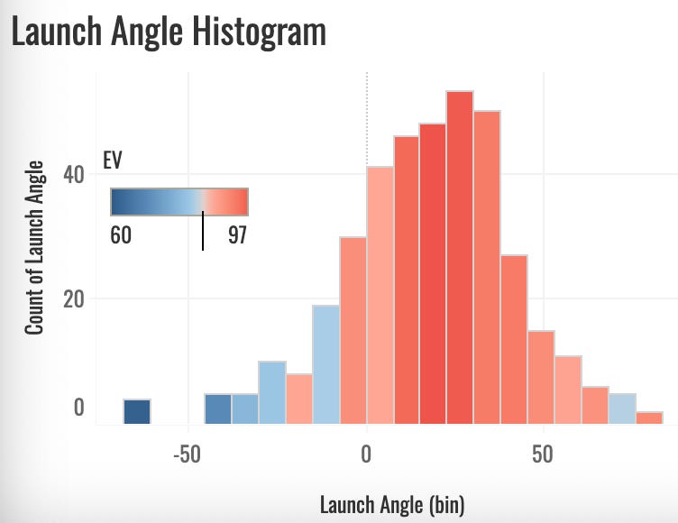 So that’s interesting. He generated consistently high EVs without much bat speed. He didn’t reach outrageous numbers at the tail, but it was a consistent approach of squaring the ball up and hitting it at the right angles. This is pretty close to the ideal launch angle histogram: