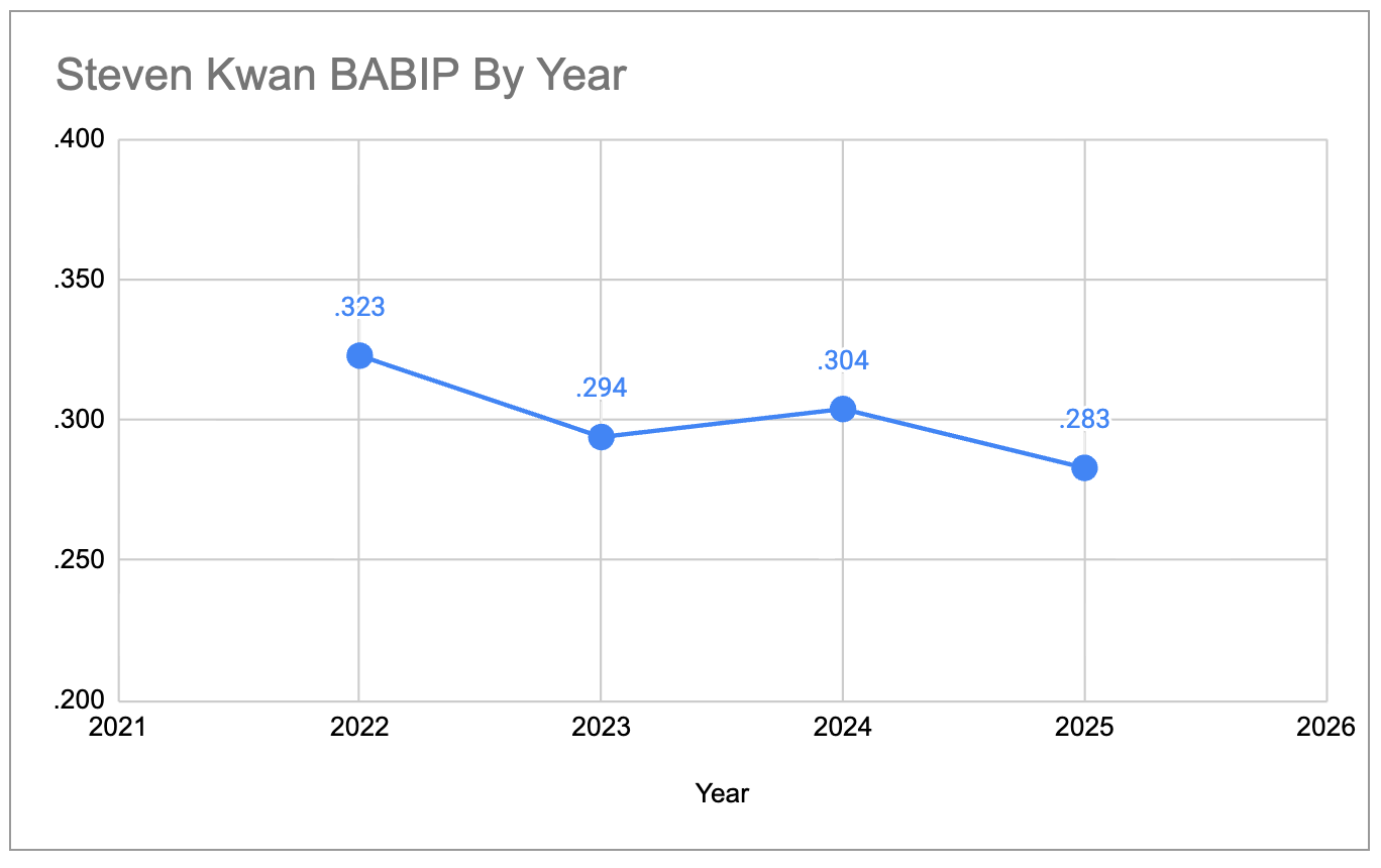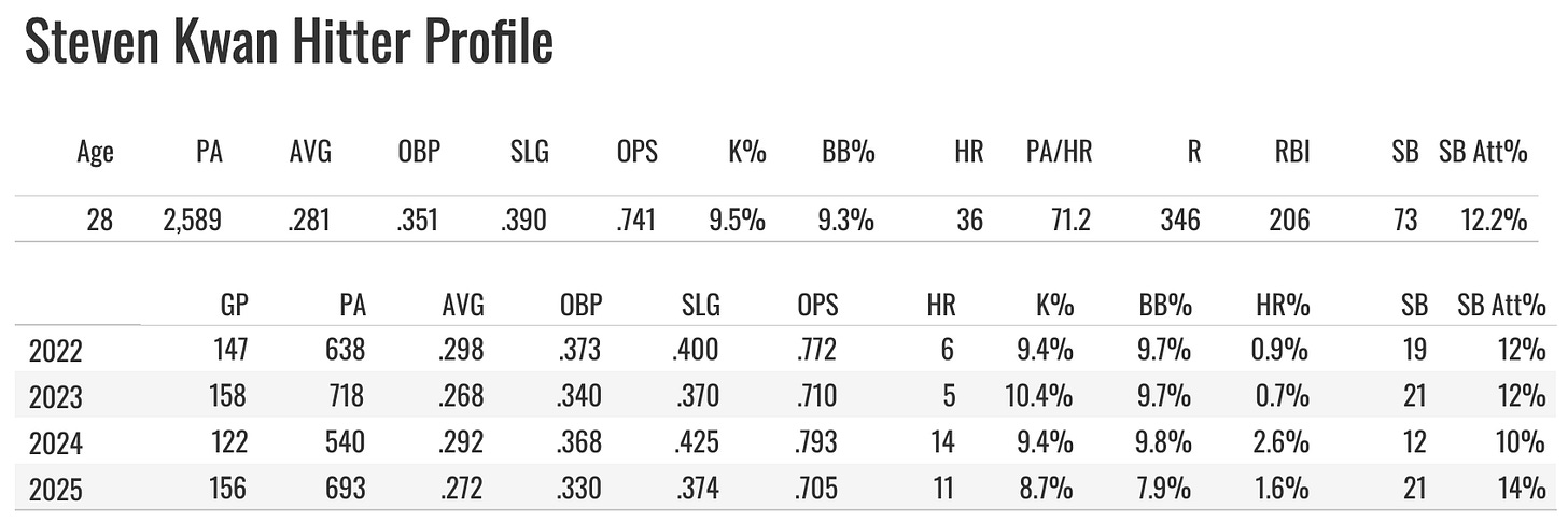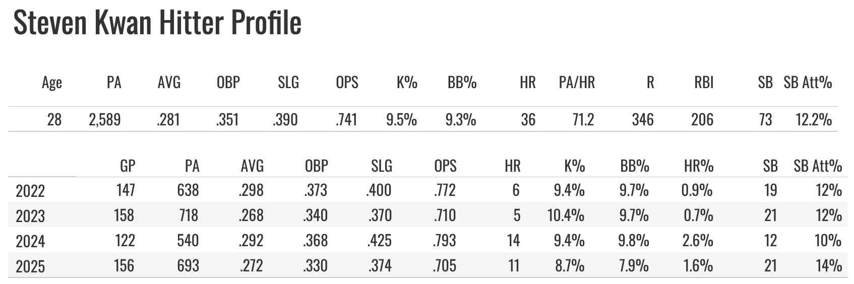Kwan hit just .268 in 2023 with a 10.4% K% and .270 last year with an even better 9% K%.