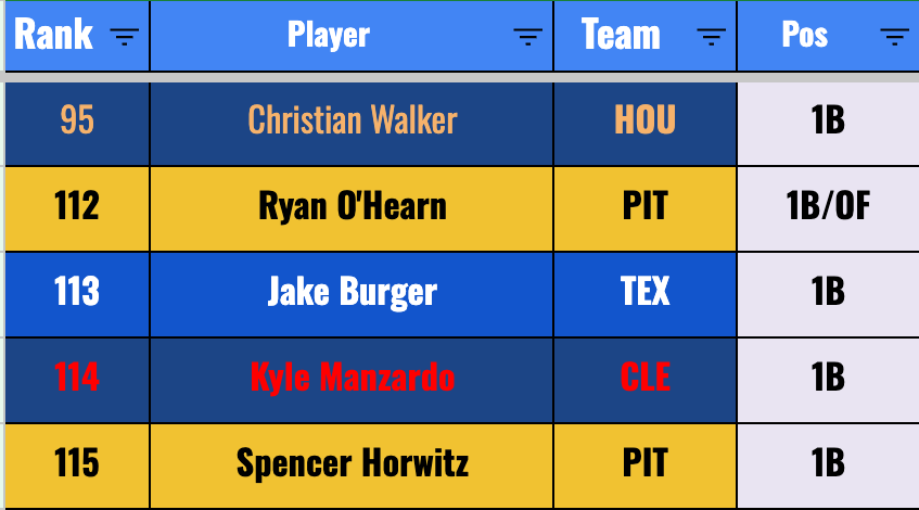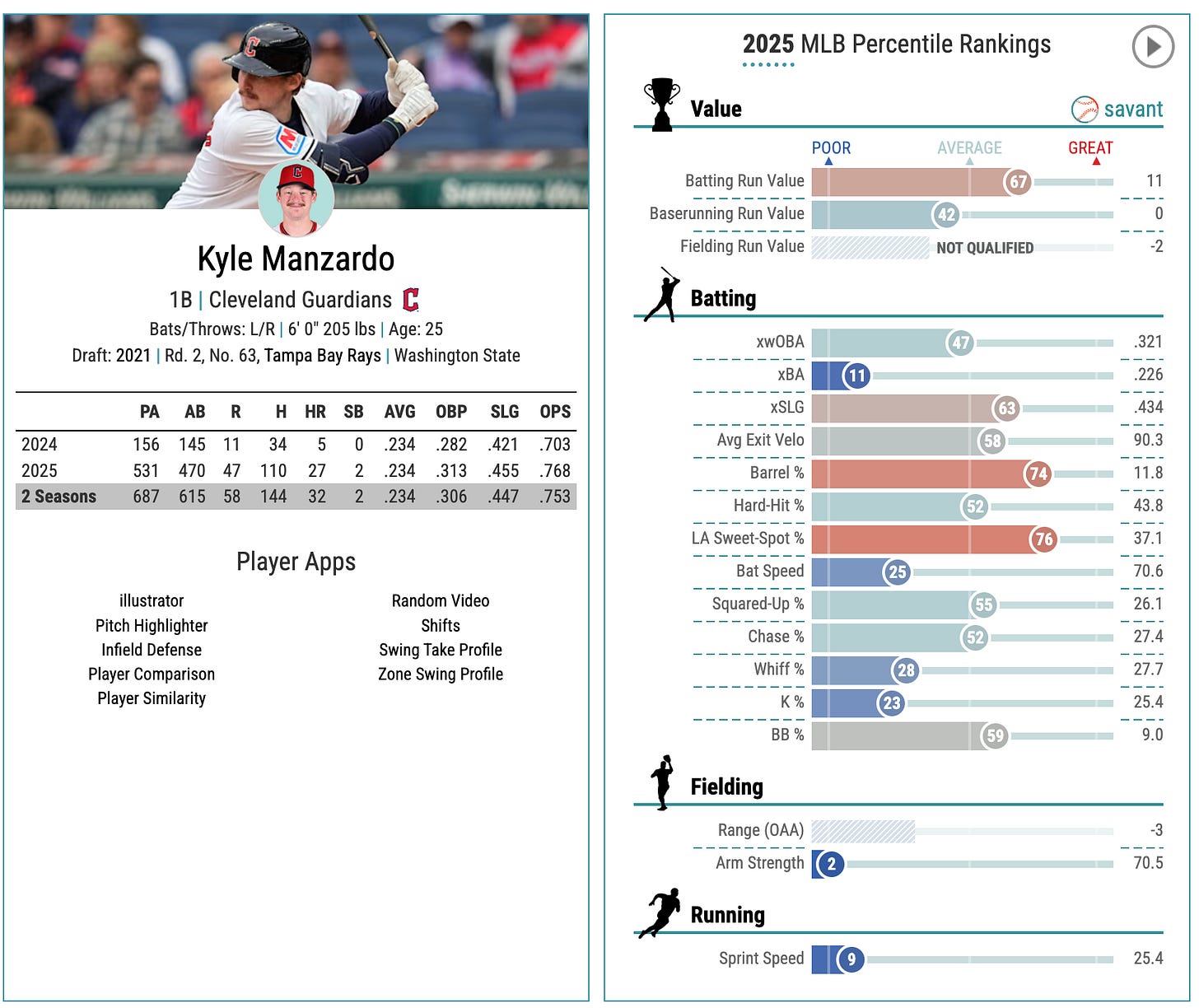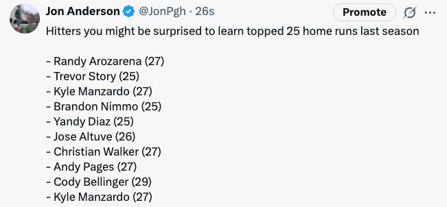If I made a list of hitters that I thought you might be surprised to find out cleared 25+ homers last year, Manzardo would be on it. In fact, I just went ahead and did this because I thought it was a fun idea.