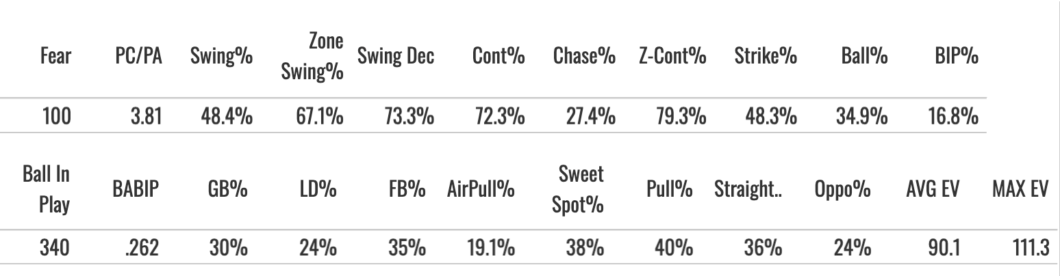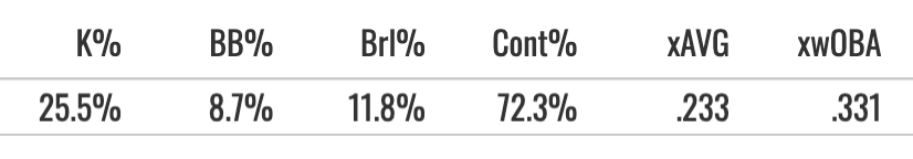 He had always made a good amount of contact in the minor leagues, but that didn’t show up last year in the Majors. The 79% zone contact rate isn’t great, and the raw power didn’t show up too big either (104.2 EV90, 111.3 max).