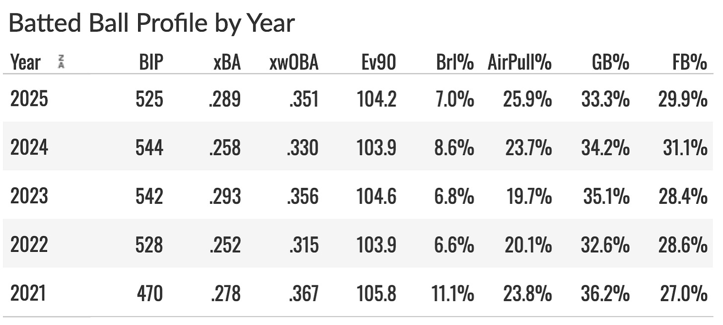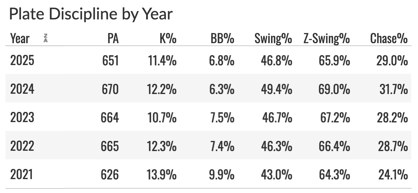 No problems found here. An elite 11.4% K% once again in 2025. The walk rate has come down a bit in the last two years, but we don’t really care about that for fantasy purposes. I somewhat prefer a 6-8% BB% in leagues where OBP doesn’t count.