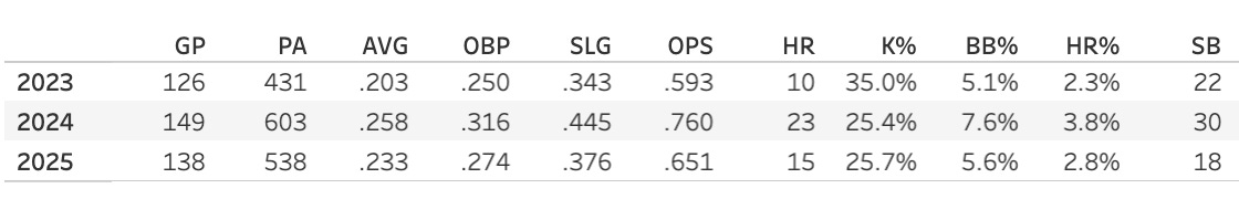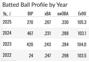 He did appear in 12 games early on in 2025 before getting sent back to the minors. The .118/.189/.235 slash line with the 38% K% could not keep him in the lineup that early in the season. But he did have a nice go of it in AAA: