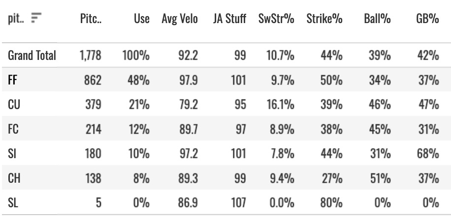 The fastball averaged 97.9 and graded well above average in the Stuff+ business. But there was something wrong with it, because it got smashed.