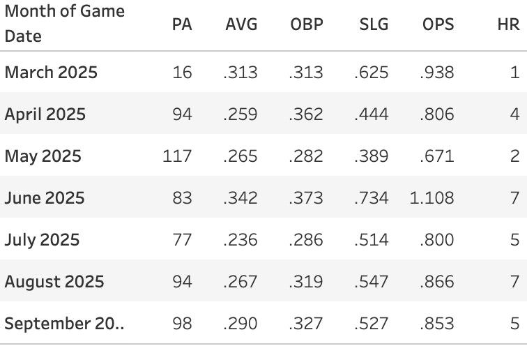 There was only one month (May) with an OPS below .700. He hit multiple homers in each month and slugged above .500 for each of the final four months.